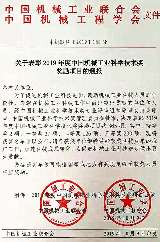 熱烈慶祝我司榮獲2019年中國機械工業(yè)科技進(jìn)步獎特等獎