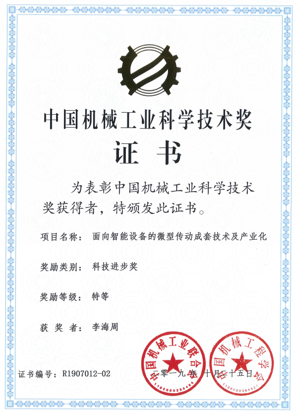 2019年10月11日,中國機械工程學(xué)會(huì )官網(wǎng)發(fā)布了《關(guān)于表彰2019年度中國機械工業(yè)科學(xué)技術(shù)獎獎勵項目的通報》,其中我司與北京工業(yè)大學(xué)、深圳市密姆科技有限公司聯(lián)合開(kāi)展的項目—面向智能設備的微型驅動(dòng)成套技術(shù)及產(chǎn)業(yè)化,榮獲科技進(jìn)步獎特等獎(證書(shū)編號 R1907012-02?頒獎信息:2019年度中國機械工業(yè)科學(xué)技術(shù)獎頒獎大會(huì )?http://www.cmiao.com.cn/cms/news/773.htm)。
